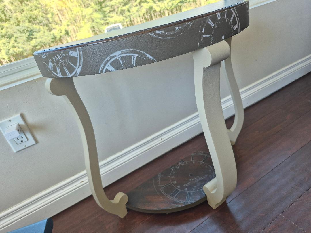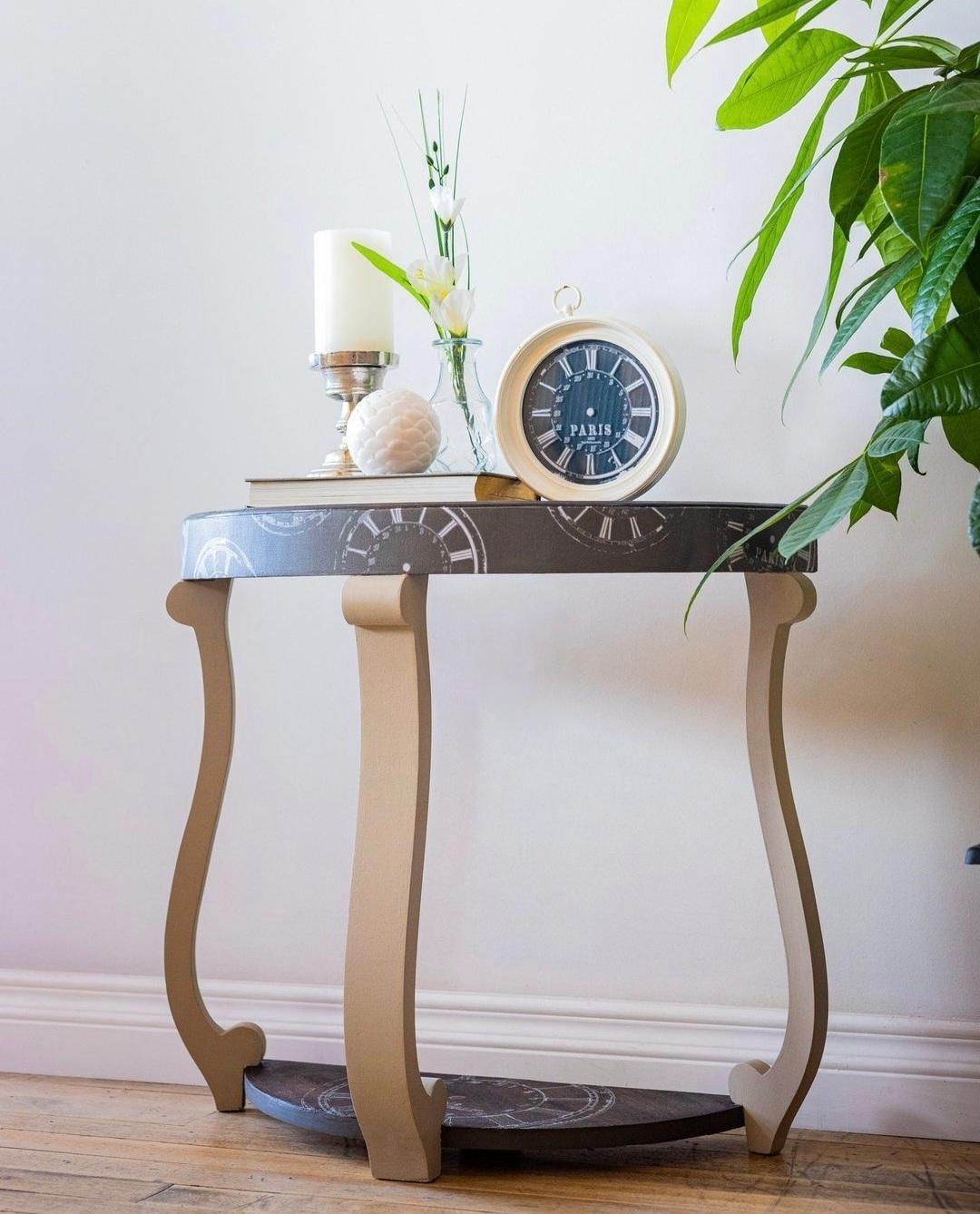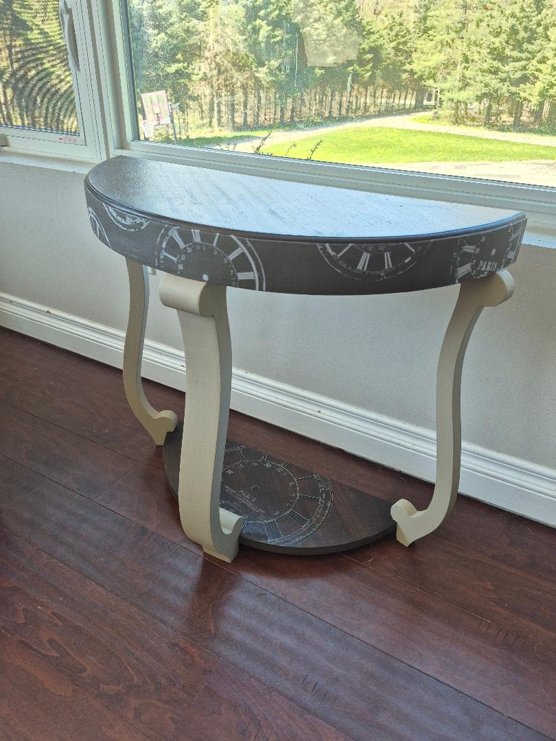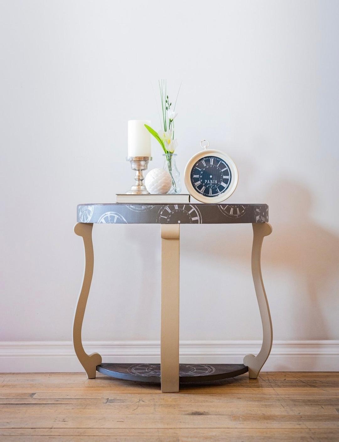 Half round entry table finished in Oakham FMP and a Walnut/Jacquard stain.