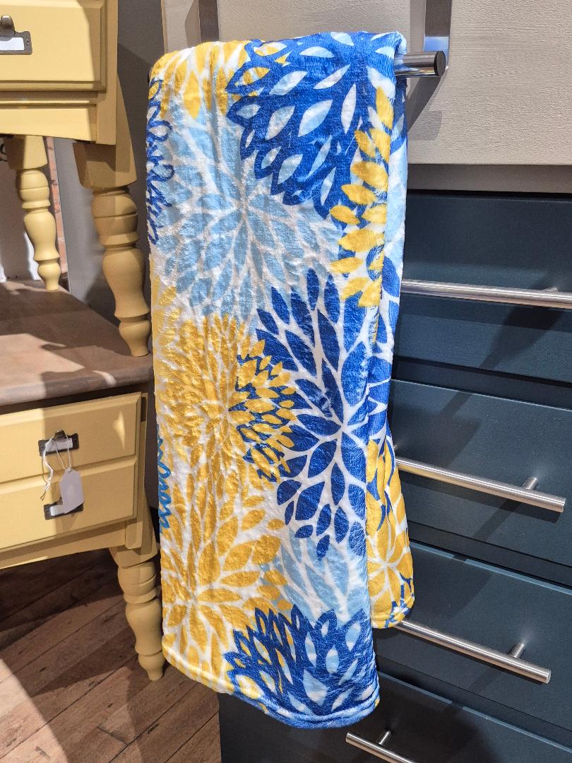 Mini micro-soft blue, white and yellow floral throw blanket.