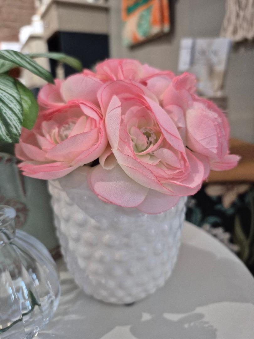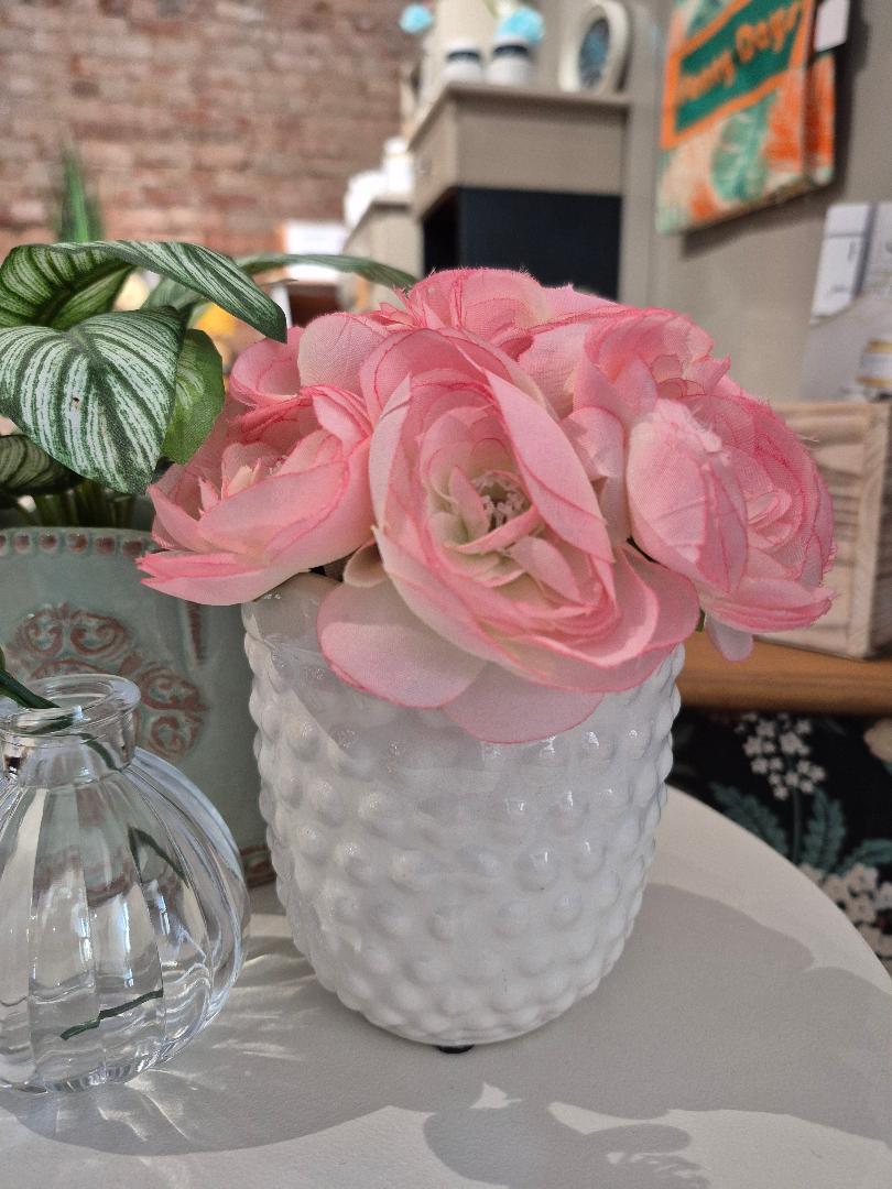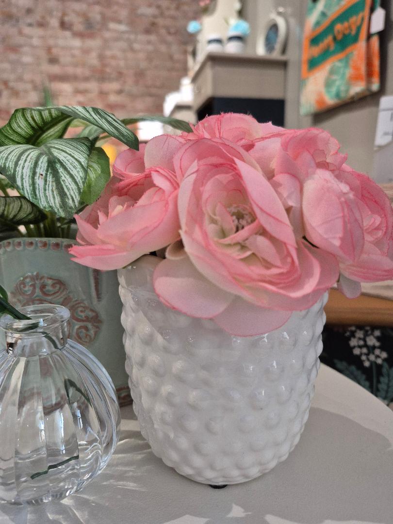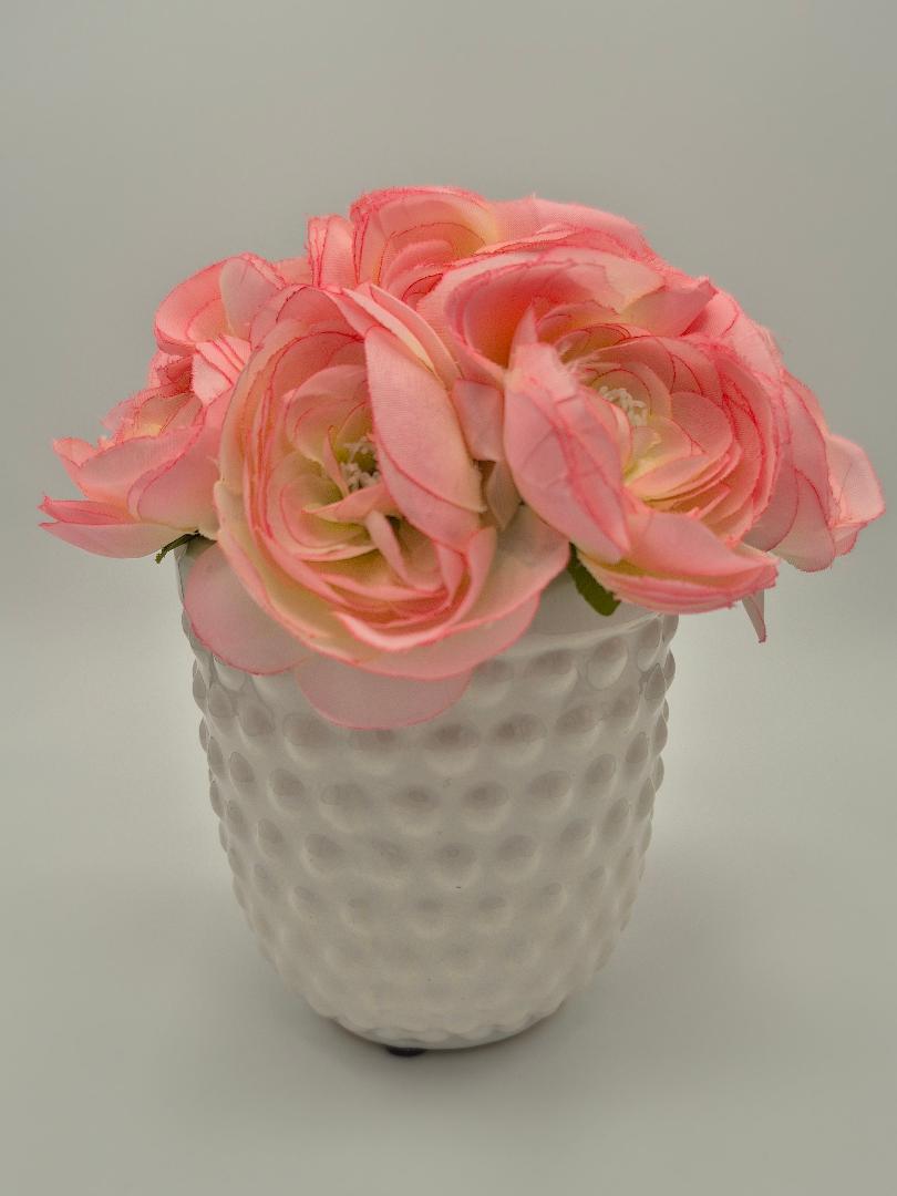 Delicate pink floral collection in dimpled white ceramic vase. Garden collection item.