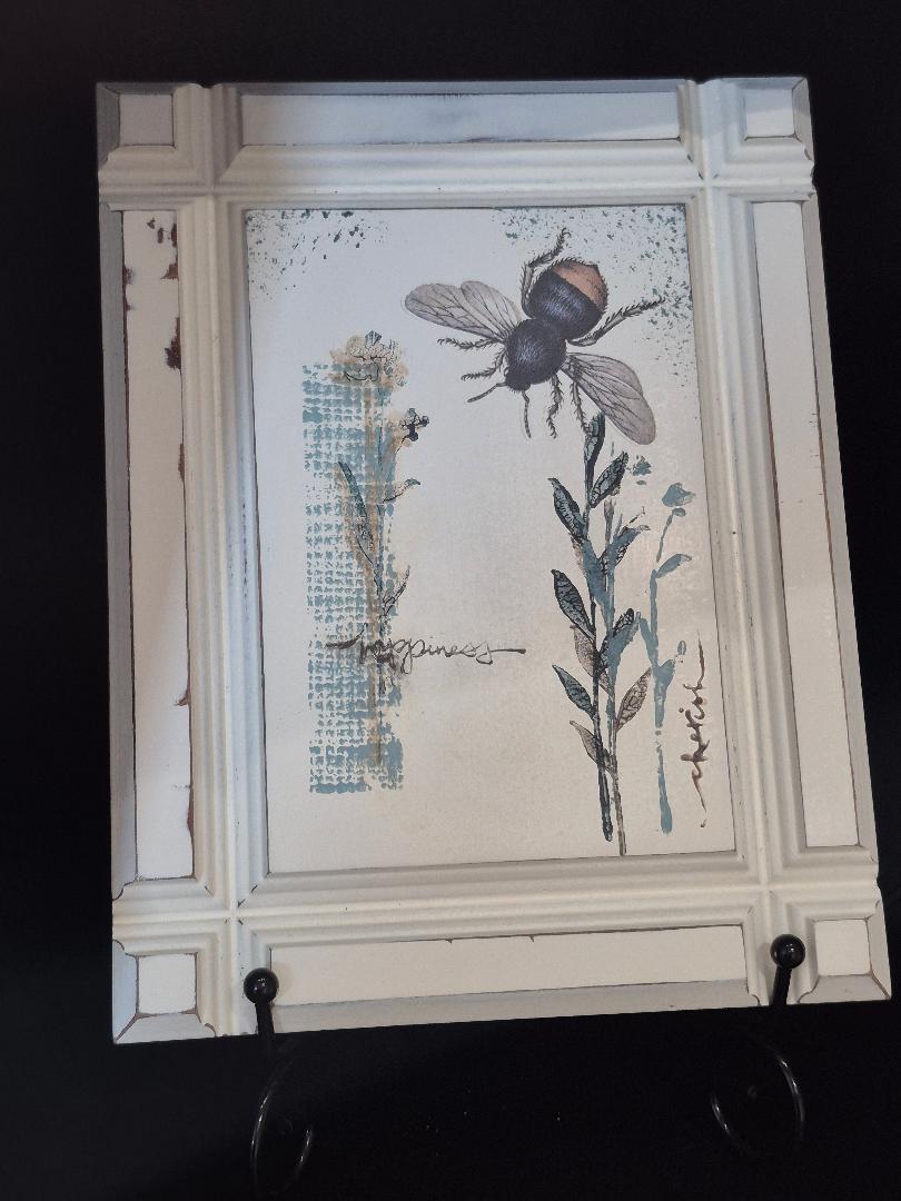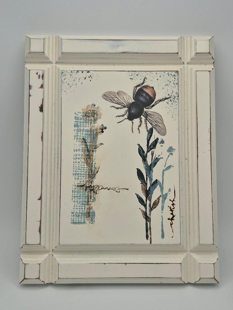 Custom designed rustic wall art, Bee, Wildflower and inspirational word details.