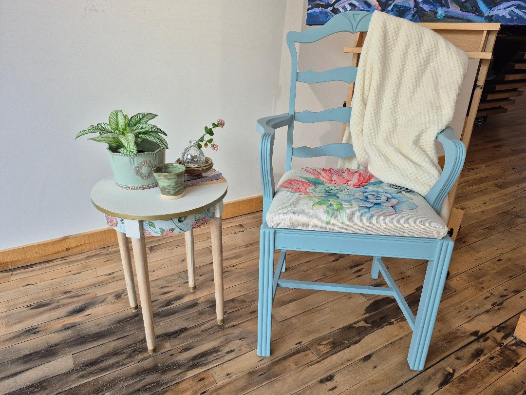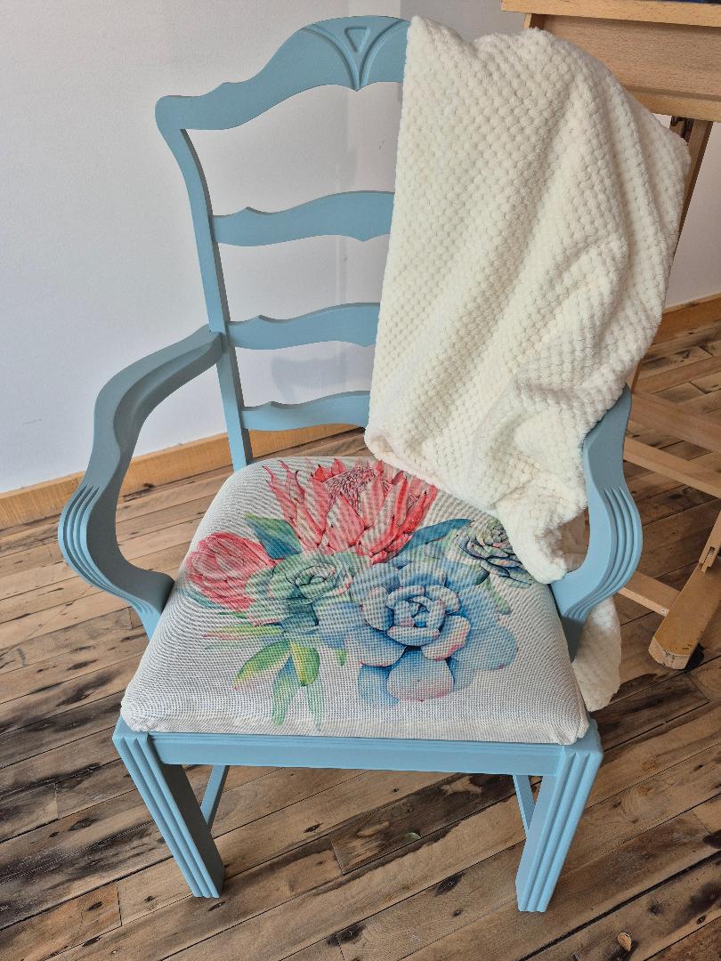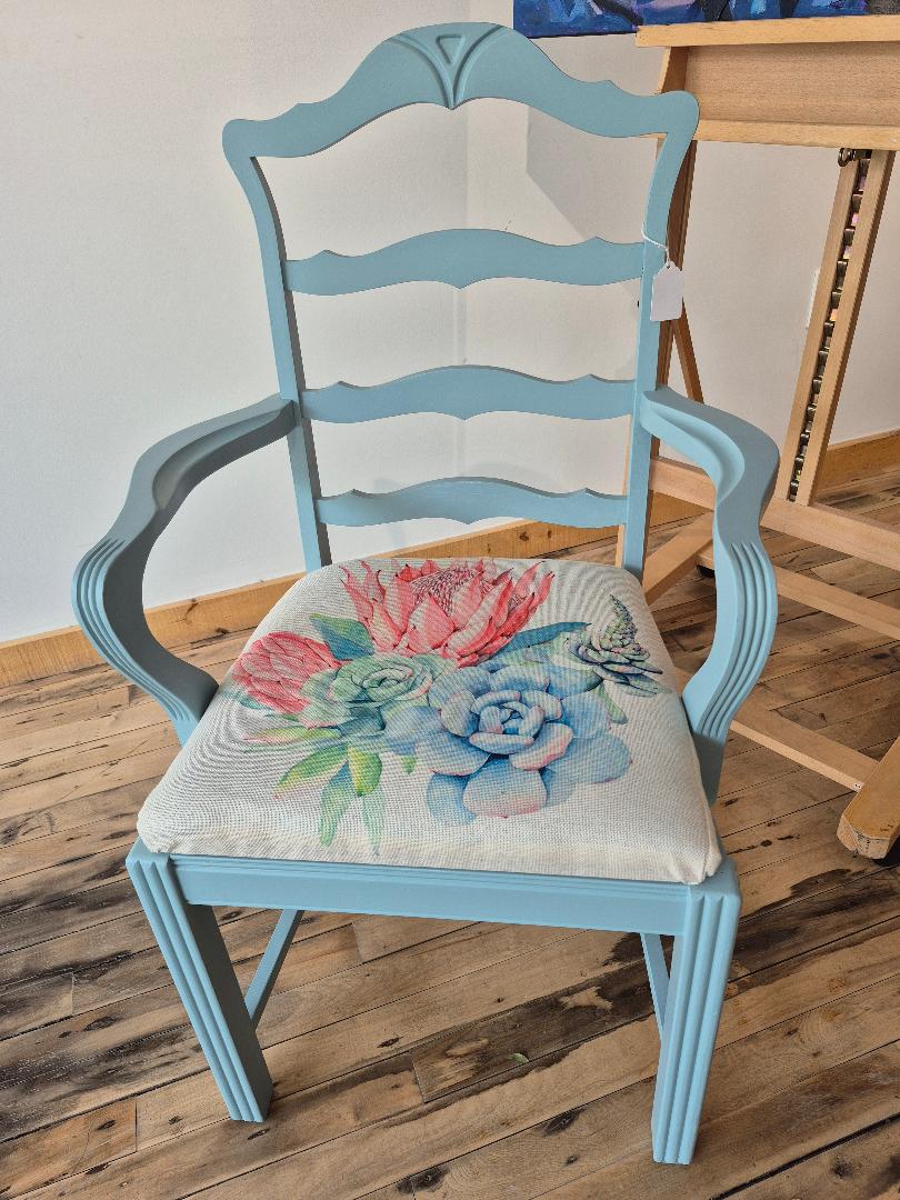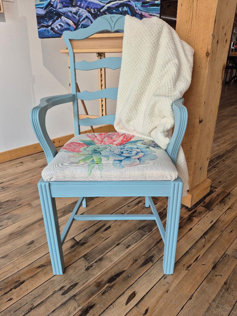 Spring floral upholstered seat compliment this vibrant Robin's Egg Blue arm chair.
